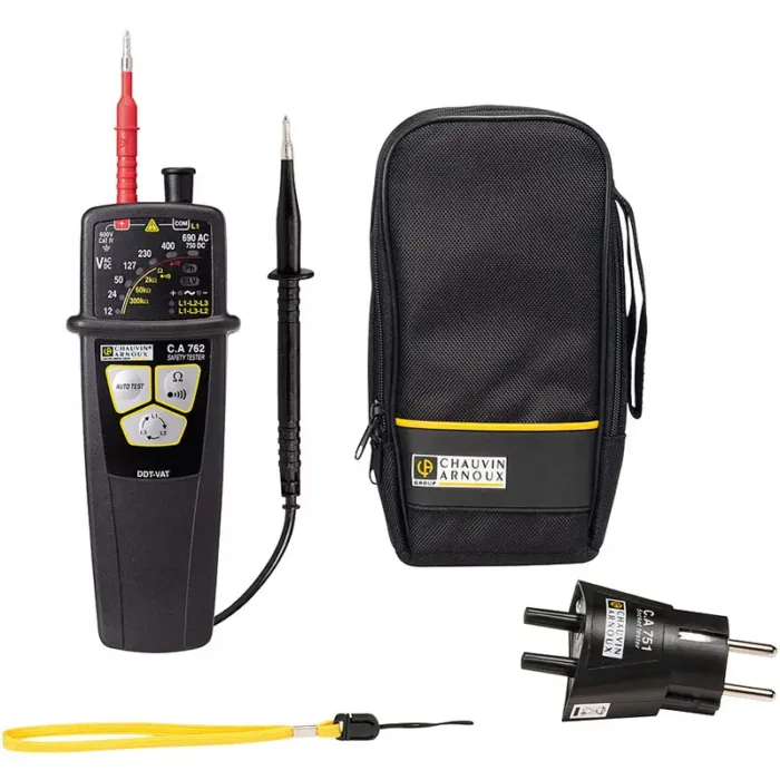 Beim umfassenden Selbsttest des CA 762 erfolgt eine Prüfung der elektrischen Schaltkreise, der Stromversorgung, der Anzeigen und des einwandfreien Zustands der Messleitungen. Die Prüfspitze und die Leitungen sind abnehmbar. Mit dem optionalen Adapter CA 753 können Prüfung an Schukosteckdosen schnell und einfach erfolgen.