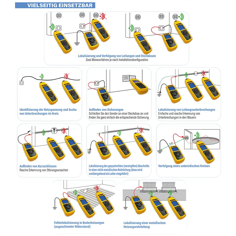 In einer elektrischen Anlage, die sowohl unter Spannung steht als auch spannungsfrei ist, können Sie damit Steckdosen, Schalter, Leistungsschalter oder Sicherungen identifizieren, die an den Stromkreis angeschlossen sind. Im Falle eines Fehlers ermöglicht er es, die Stelle eines Kurzschlusses, einer Unterbrechung oder einer Trennung zu lokalisieren.