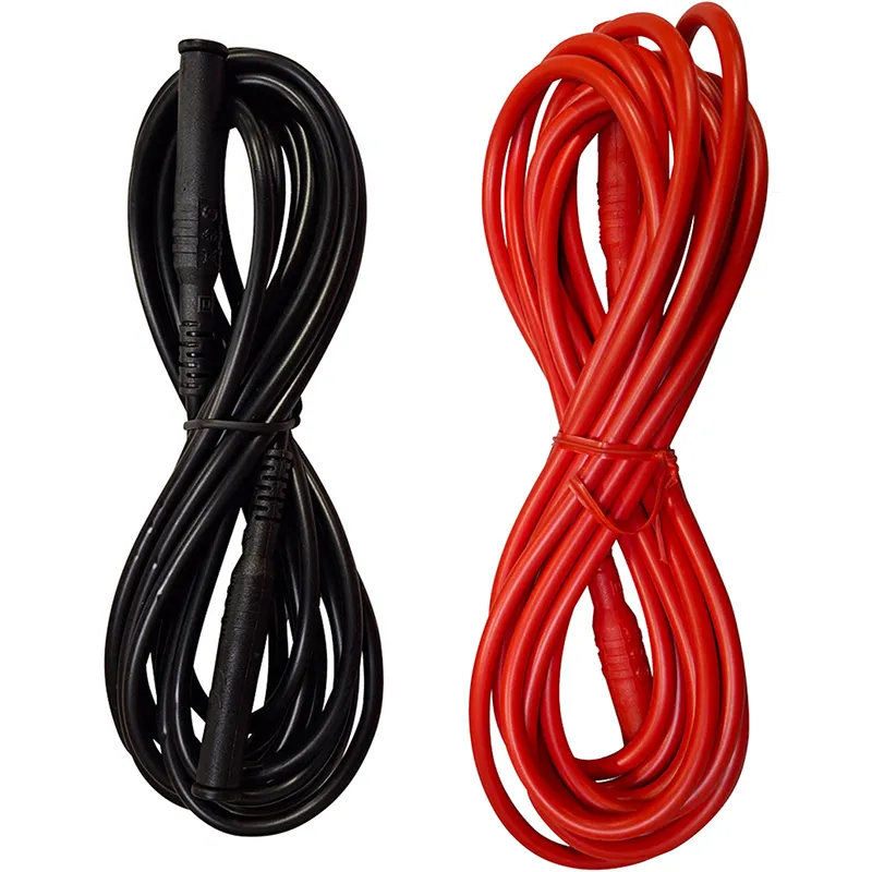 Ersatz-Messleitungen für Maschinentester CA 6121 / CA 6160 / CA 6165. Für die Isolationsmessung. 2 Messleitungen mit 3 m Länge in rot / schwarz. Gerader Stecker Ø 4 mm isoliert – Gerader Stecker Ø 4 mm isoliert. 600 V CAT IV / 1000 V CAT III.