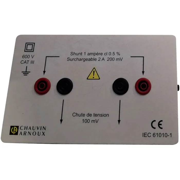 Labor-Nebenwiderstand zur Messung hoher DC-Ströme mit einem Voltmeter bei größtmöglicher Sicherheit. Schutzisoliert gemäß IEC 61010, CAT III 600 V. Sicherheitsbuchsen und stoßfestes, selbstverlöschendes Gehäuse. Genauigkeitsklasse 0,5 und sehr kleiner Temperaturkoeffizient. Kurzzeitig überlastbar bis 2 A/200 mV.