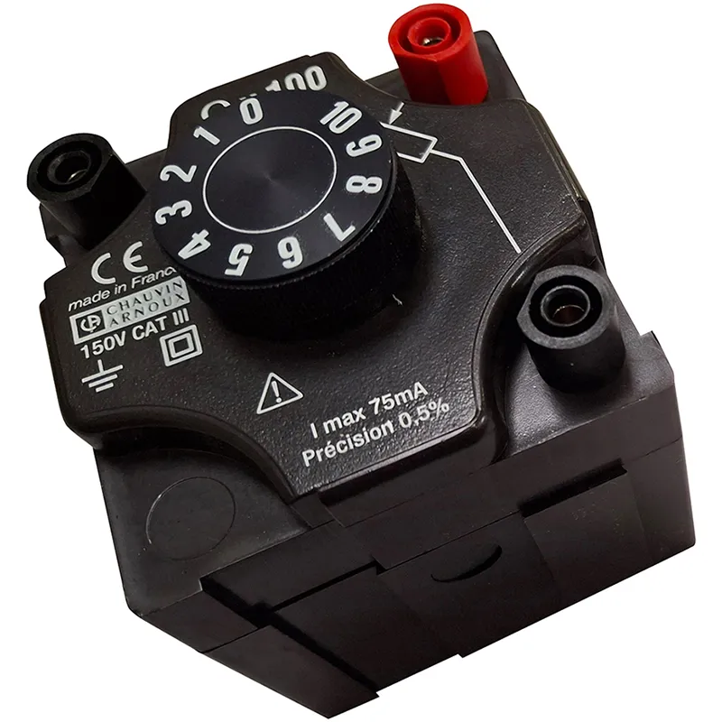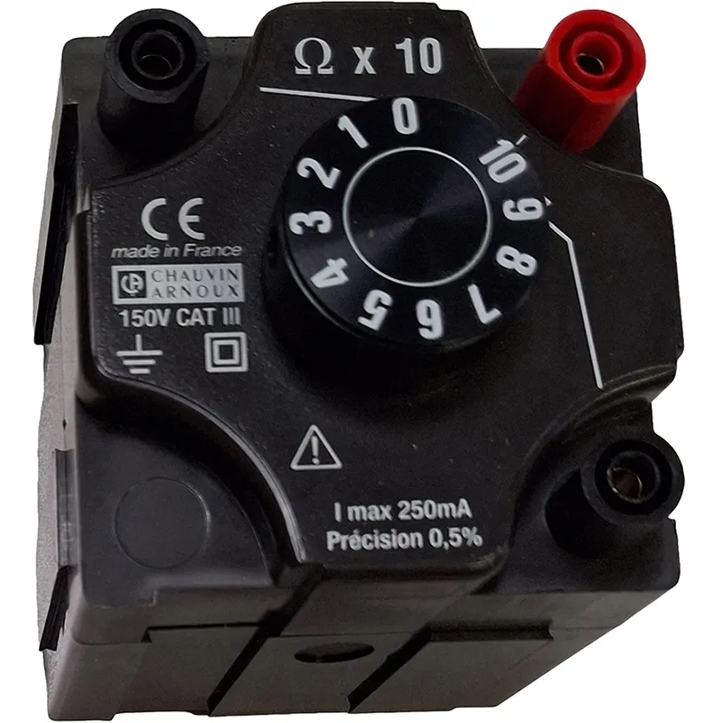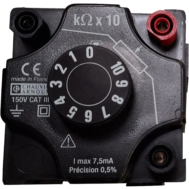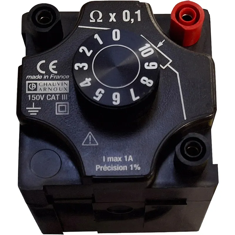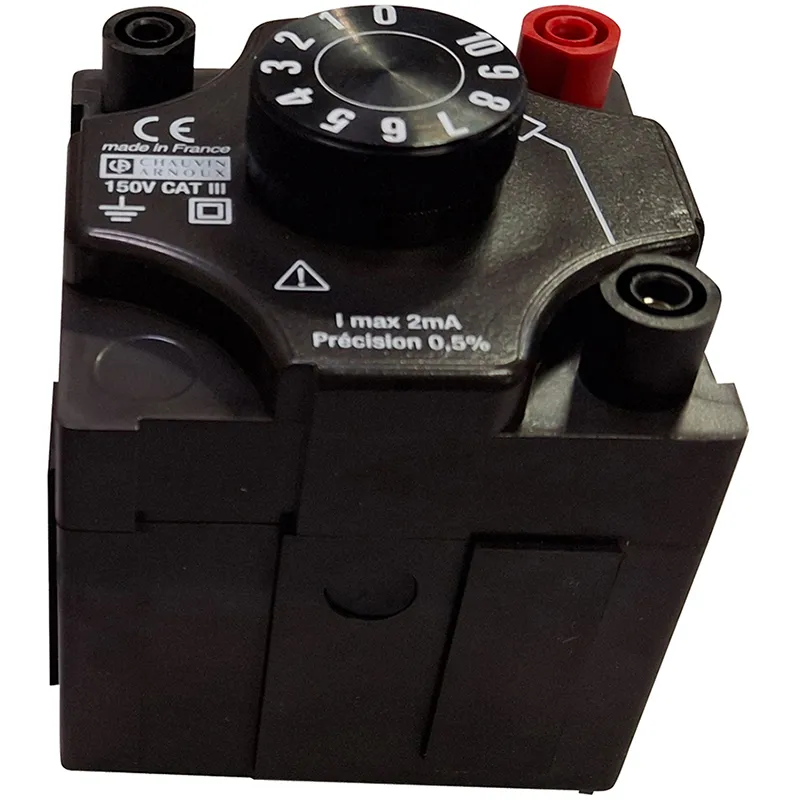 • Gehäuse mit 1 Dekade mit 11-stelligem Wahlschalter (0 = Kurzschluss) und mit 3 Sicherheitsbuchsen Ø 4 mm